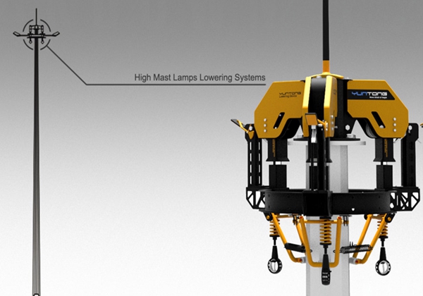 高桿燈的掛鉤可以360°旋轉,啟動卷揚機,將主鋼絲繩往下拉十公分,然后調成反轉,高桿燈內部的主鋼絲繩開始往上升,固定在燈盤上的三根副鋼絲繩開始往下降,直到落在地面,燈頭哪里出了問題一目了然,省去了很多不必要的機械費,也不會發生高空作業的任何危險。